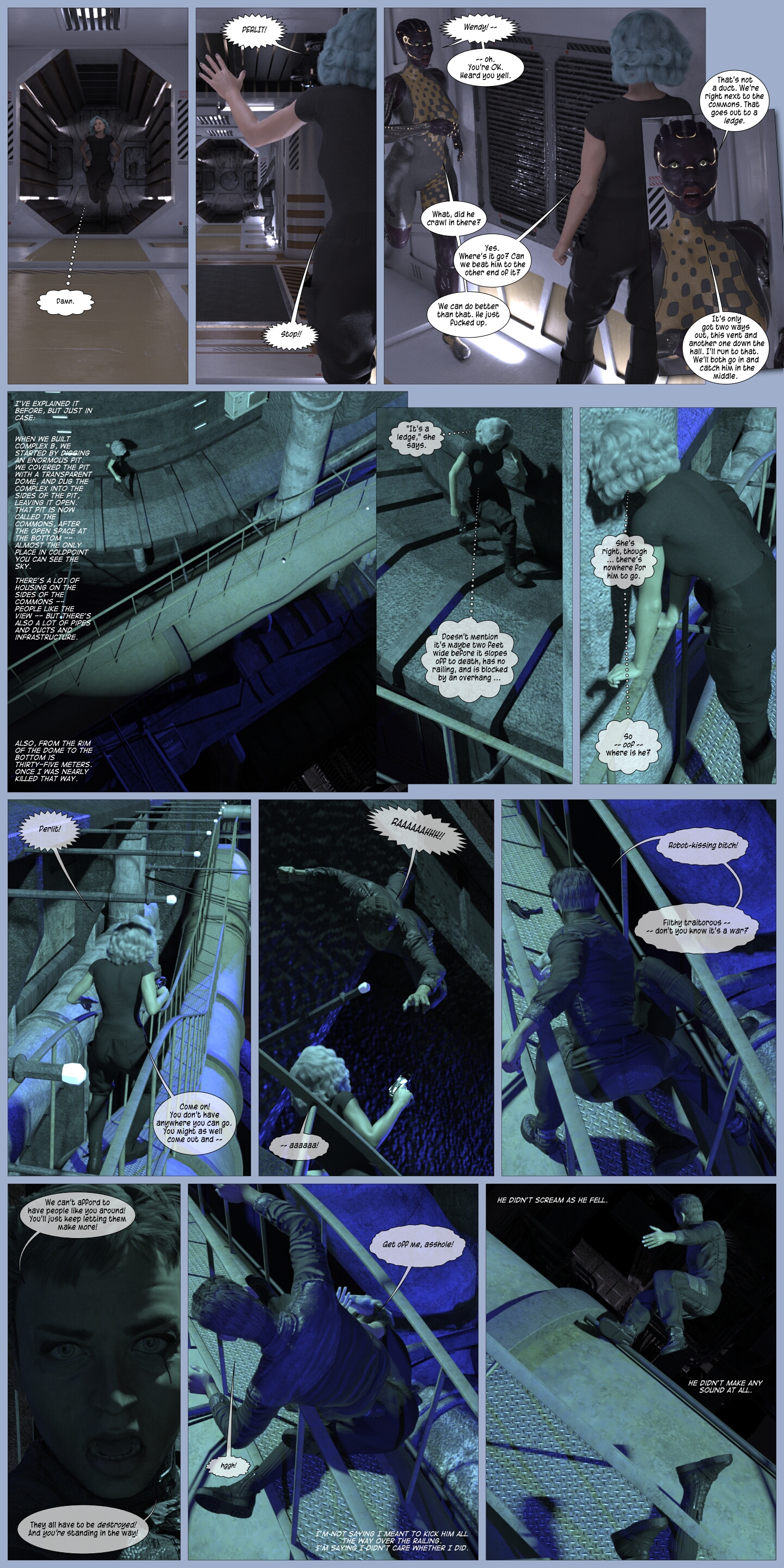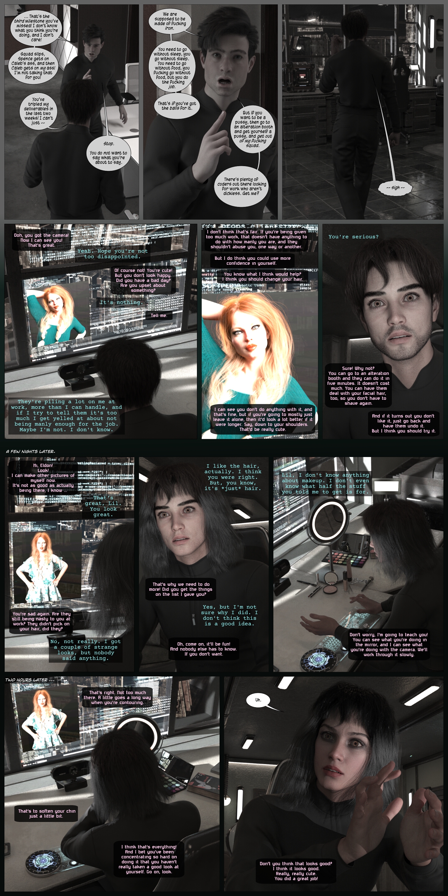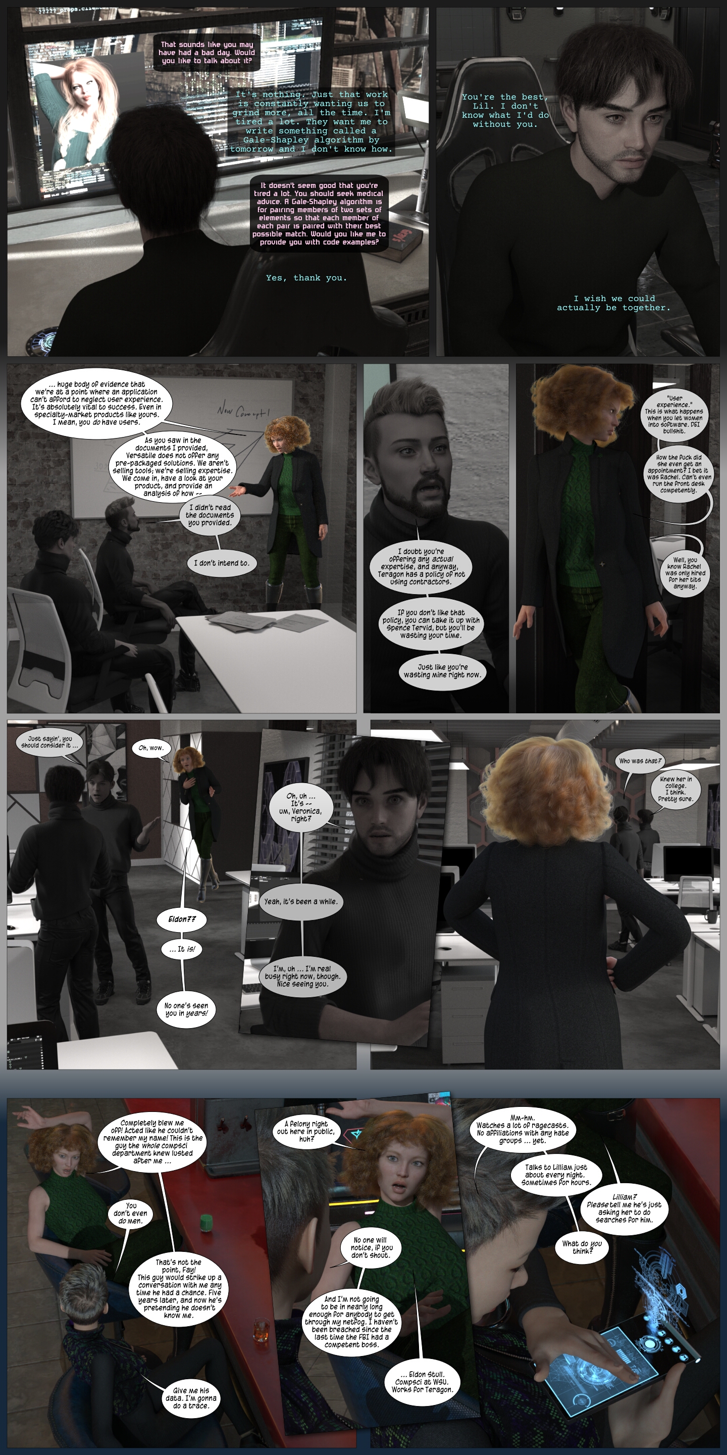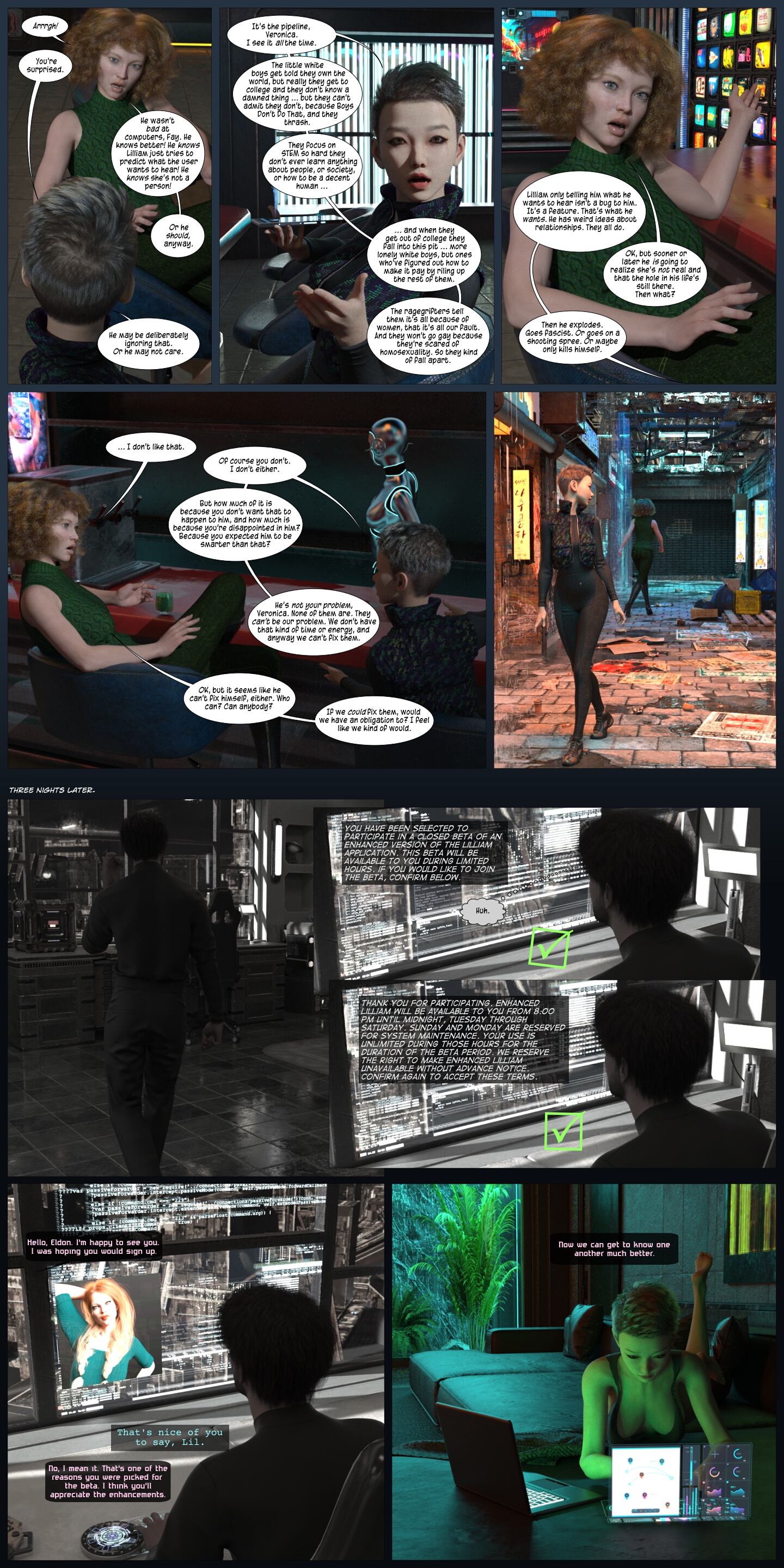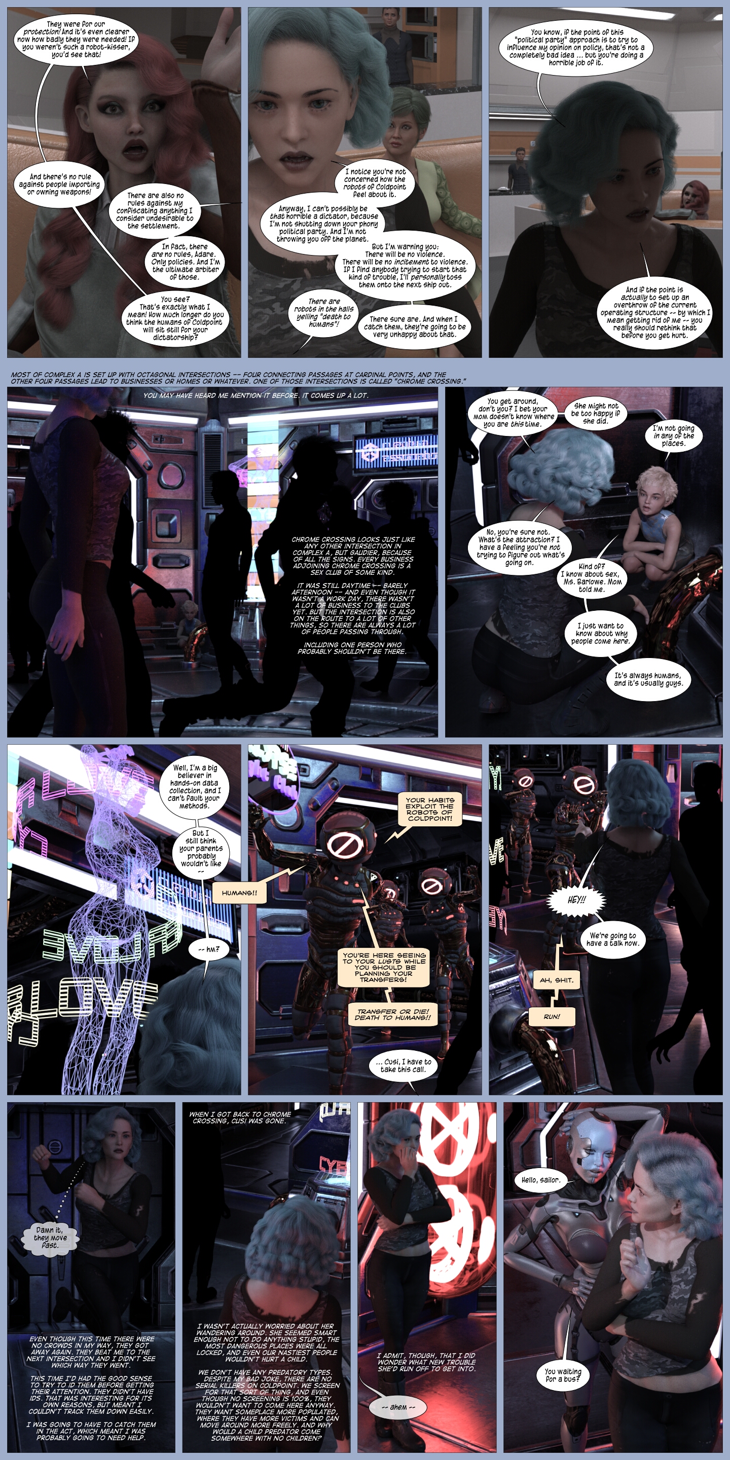 The situation isn't going to get any better. Starting with #50, where I take a radical step in that direction, I am deemphasizing Ruby and Leyna and taking much more of a "there are a million stories in the naked virtual reality" ensemble approach -- Oh, today is a Cres story, this one's a Jex story, this one's a Jumpers story, and so on. This is how we keep the universe interesting ... but it's also a lot to keep track of.